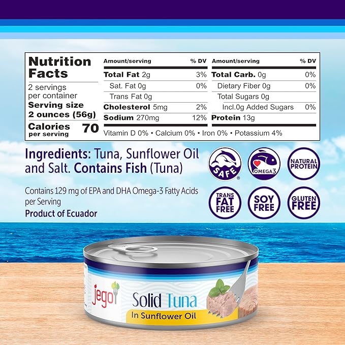 Includes 1 can (5 oz) of JEGO® Solid Tuna in Sunflower Oil. Long shelf life and pantry-friendly.